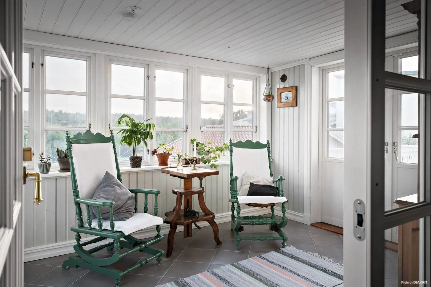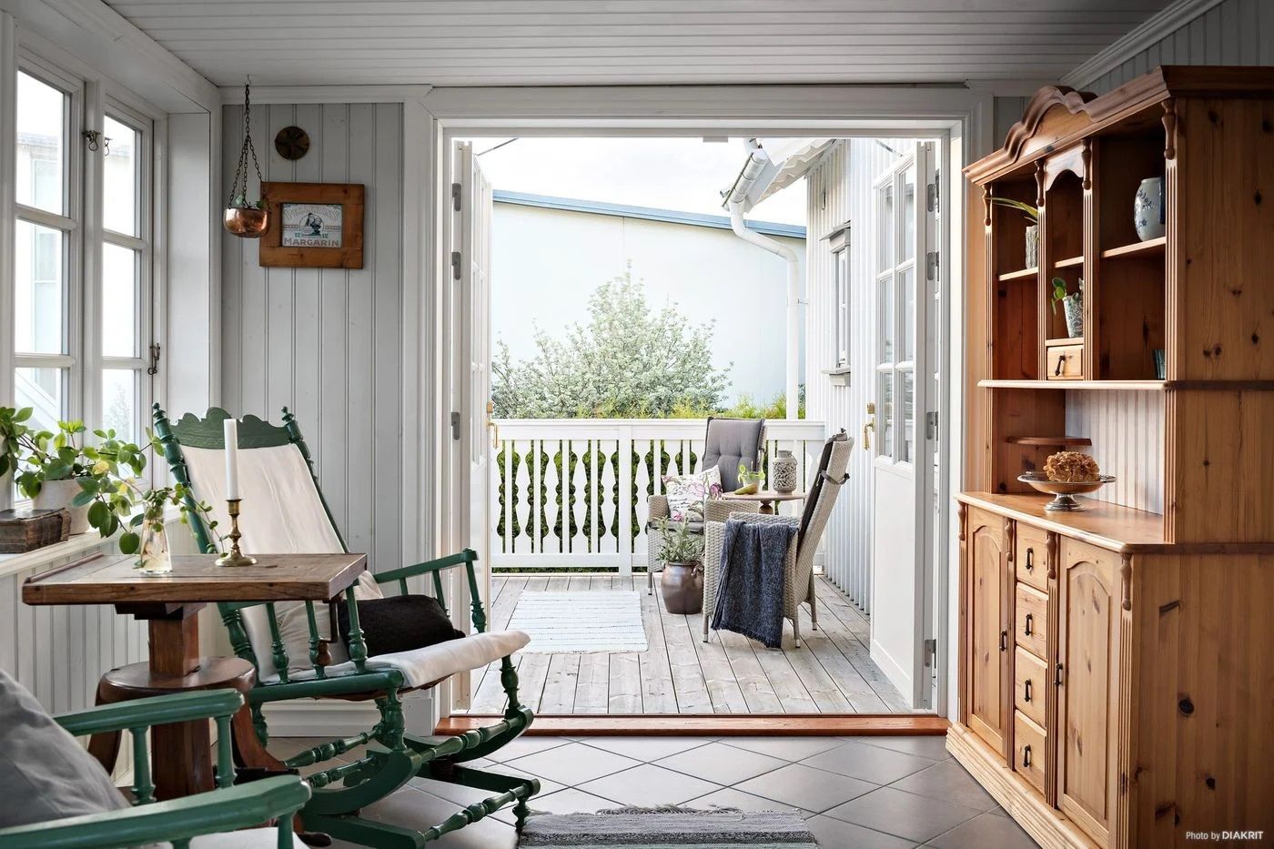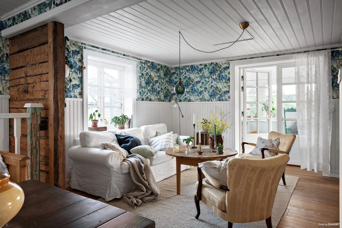 Ruokasalista johtaa iso aukko olohuoneeseen, jossa molemmille puolille avautuvat ovet johtavat pienelle, viihtyisälle verannalle. Verannalla kiinnittävät huomiota kauniit vihreäksi maalatut antiikkiset lepotuolit, jotka erottuvat kauniisti valkoista taustaa vasten. Veranta johtaa myös pienelle parvekealueelle, jossa voit nauttia aamukahvisi tai viettää aikaa ystävien kanssa. Olohuoneessa on sama kaunis kukkainen tapetti ja valkoiset seinäpaneelit kuin ruokasalissa, mikä auttaa yhdistämään kauniisti kaksi erilaista tilaa. Tästä olohuoneesta tulee myös kodin ensimmäinen makuuhuone, jossa kaunis tapettivalikoima seinillä lisää katseenvangitsijaa.