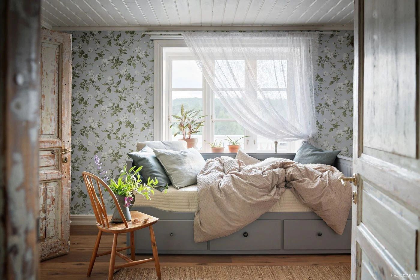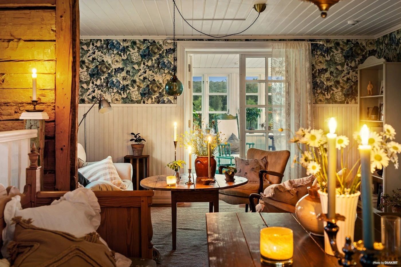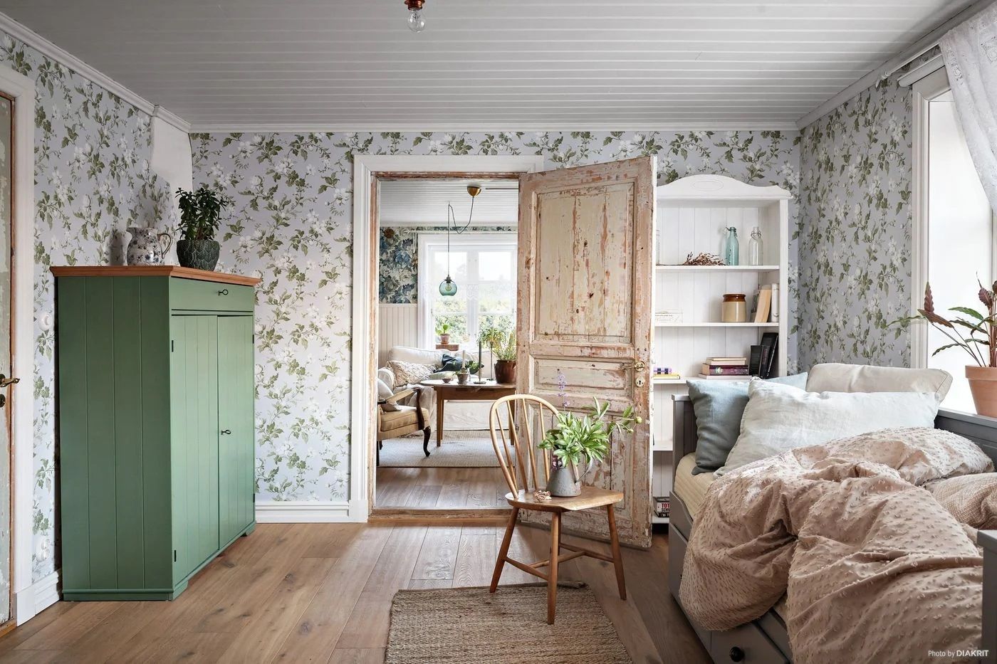 Ruokasalista johtaa iso aukko olohuoneeseen, jossa molemmille puolille avautuvat ovet johtavat pienelle, viihtyisälle verannalle. Verannalla kiinnittävät huomiota kauniit vihreäksi maalatut antiikkiset lepotuolit, jotka erottuvat kauniisti valkoista taustaa vasten. Veranta johtaa myös pienelle parvekealueelle, jossa voit nauttia aamukahvisi tai viettää aikaa ystävien kanssa. Olohuoneessa on sama kaunis kukkainen tapetti ja valkoiset seinäpaneelit kuin ruokasalissa, mikä auttaa yhdistämään kauniisti kaksi erilaista tilaa. Tästä olohuoneesta tulee myös kodin ensimmäinen makuuhuone, jossa kaunis tapettivalikoima seinillä lisää katseenvangitsijaa.