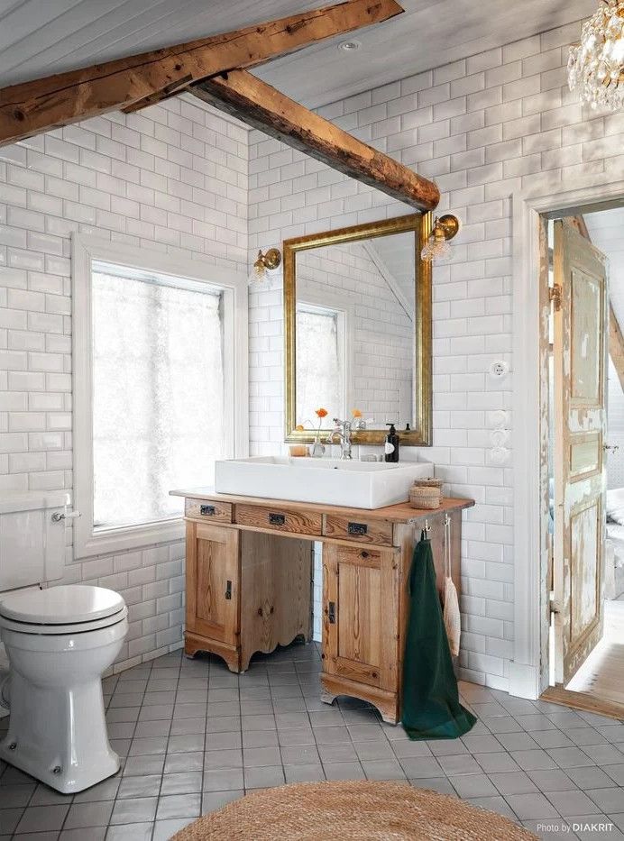 Kaunis kylpyhuone, jossa tila on erittäin tyylikkäästi suunniteltu. Upea kynsijalkakylpyamme, vanhat kattopalkit ja antiikki lipasto sekä hyvin valitut keraamiset laatat luovat upean lopputuloksen.