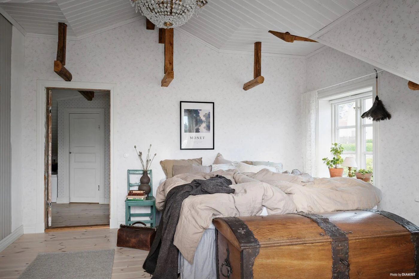 Viihtyisä makuuhuone, jossa vaaleanvihreä-harmaat seinät, vanhat puupalkit katossa lisäävät tehoa.