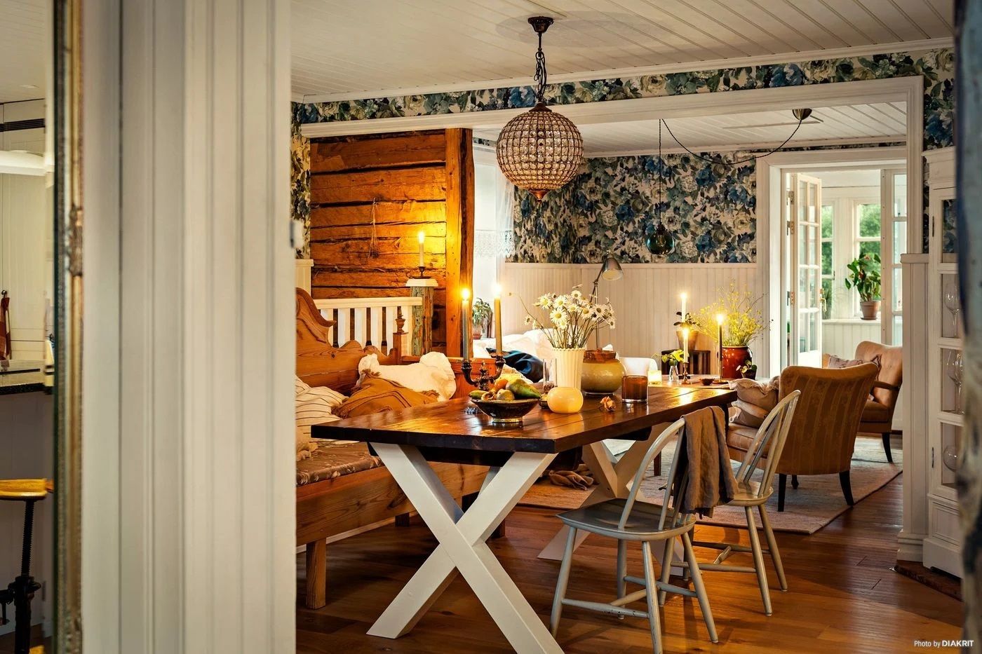 Ruokailutilan ja keittiön lattiaa peittää lämmin ja luonnollinen puuparquet, jonka sileä pinta tasapainottaa klassisia seinäpintoja – valkoisia, osin paneloituja ja osin kukkakuosisella tapetilla koristeltuja. Juuri tuo tapetti antaa huoneelle sen luonteen – hieman nostalginen, mutta täysin ajan hermolla.