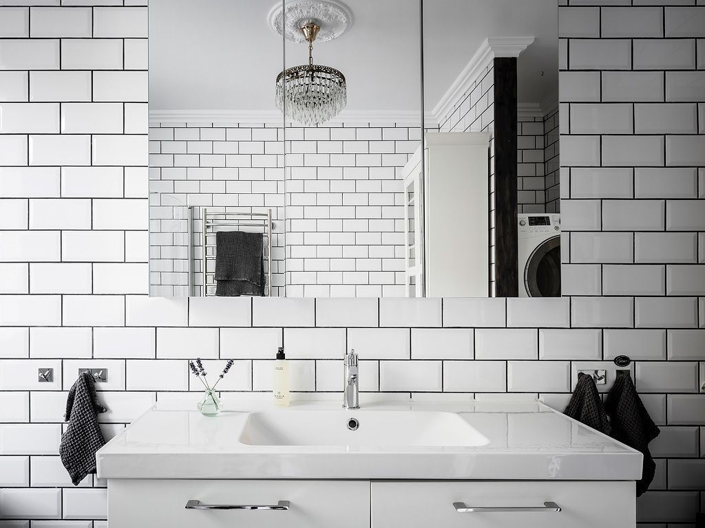 Miltä valkoinen keraaminen laatta mustalla laastilla näyttäisi kylpyhuoneessa?