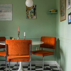 Jotta mustat keittiökalusteet eivät näyttäisi liian painavilta, se yhdistetään valkoisiin seiniin, jotka tuovat enemmän valoa ja tilaa huoneeseen. Alkuperäiset puiset seinäpaneelit on viimeistelty valkoiseksi ja työtason takana oleva seinä on päällystetty keraamisilla laatoilla, joissa mustat laastiviivat luovat hienovaraisen mutta tehokkaan kontrastin. Kokonaisvaikutelmaa tasapainottaa luonnonpuulattia, jonka lämmin sävy pehmentää mustien keittiökalusteiden vahvuutta ja lisää huoneeseen viihtyisyyttä.