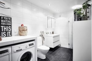Lisäksi kylpyhuoneessa on hyvin harkittu säilytysjärjestelmä seinälle sijoitettuna. Tämä järjestelmä on valmistettu kankaasta ja puusta ja sopii täydellisesti pienen tilan tarpeisiin, koska sen avulla voit kätevästi säilyttää wc-paperia, pyyhkeitä ja muita tarpeellisia esineitä. Säilytysjärjestelmä on minimalistinen mutta käytännöllinen ja sopii harmonisesti huoneen yleiseen tyyliin. Kylpyhuoneen viimeistelymateriaalien valinta on tehty huolella, laatua ja estetiikkaa painottaen. Lattialaatat ovat mattamustia neliömäisellä kuviolla, joka luo jännittävän kontrastin muun kylpyhuoneen vaaleampiin pintoihin. Nämä laatat sopivat täydellisesti sekä wc-istuimen että suihkuverhon kanssa, joiden kuviointi on myös huolellisesti valittu, jotta koko tilasta tulee visuaalisesti yhtenäinen ja harmoninen. Seinät on viimeistelty kiiltävän valkoisilla seinälaatoilla, saumakohdat täytetty harmaasävyllä. Tämä harmaasävy lisää syvyyttä huoneeseen ja korostaa seinälaattojen puhtautta ja kiiltoa.