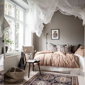 Tässä tilavassa ja tyylikkäässä makuuhuoneessa on todella harmoninen tunnelma, joka on luotu huolellisesti valituilla materiaaleilla ja väreillä. Ensi silmäyksellä erottuvat tyylikkäät, pehmeät sävyt, jotka luovat rauhallisen ja rentouttavan tunnelman. Seinät on peitetty silmiinpistävällä tapetilla, jota hallitsee luonnollinen ja herkkä beige värimaailma. Tässä tapetissa kuvatut kani-aiheet lisäävät pehmeitä ja leikkisä yksityiskohtia säilyttäen samalla tyylikkään kokonaisvaikutelman. Tapetin on luonut Emma von Brömssen ja sen muotoilu heijastelee taitavasti luonnon kauneutta luoden rauhoittavan ja ainutlaatuisen tunnelman, joka sopii täydellisesti makuuhuoneeseen.
