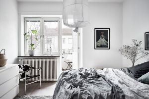 Valkoiseksi maalattu puulattia, joka peittää koko huoneen, luo upean kontrastin ja korostaa tapetin vivahteita. Lattiassa olevat puuraot lisäävät huoneeseen luonnetta ja antavat sille hieman maalaismaisen ja luonnollisen tunnelman. Valkoinen lattia korostaa myös korkeat, tyylikkäät valkoiset jalkalistat, jotka kehystävät huonetta ja luovat visuaalisesti puhtaan ja järjestetyn ilmeen. Koko makuuhuone heijastelee minimalismin ja yksinkertaisuuden kauneutta, jota tukevat valkoiset huonekalut, kuten minimalistinen vaatekaappi ja tyylikäs lipasto. Nämä huonekalut eivät palvele vain käytännöllistä tarkoitusta, vaan myös harmonisoituvat täydellisesti muun sisustuksen kanssa tuoden huoneeseen valoa ja avaruutta.
