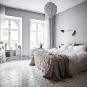 Minimalistiset mustat seinävalaisimet ovat hienovarainen mutta tehokas lisä, joka täydentää koko makuuhuoneen suunnittelua. Nämä valaisimet luovat hienotunteisen mutta silmiinpistävän kontrastin valkoisen ja beigen väripaletin välille tarjoten juuri tarpeeksi visuaalista mielenkiintoa olematta kuitenkaan liian hallitsevia. Myös jotkut harmaat koriste-elementit, jotka on sijoitettu ikkunalaudoille, lisäävät tilaan uuden hienovaraisen kerroksen, mikä antaa herkän tasapainon ja viimeistellyn ilmeen. Kaikki nämä huolellisesti valitut elementit ja yksityiskohdat yhdessä luovat tilan, joka ei ole vain visuaalisesti harmoninen, vaan myös käytännöllisesti mukava ja toimiva. Jokainen yksityiskohta on asetettu paikoilleen suurella huolella ja huomiolla, mikä luo kokonaisuuden, joka heijastaa rauhaa, tasapainoa ja eleganssia.