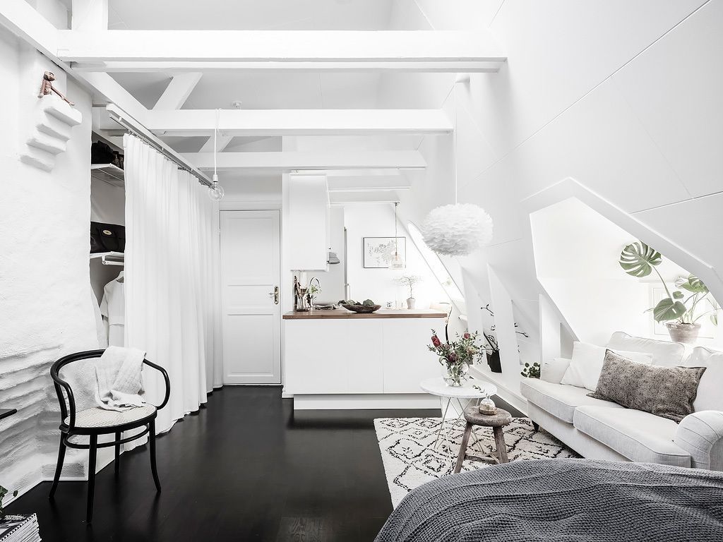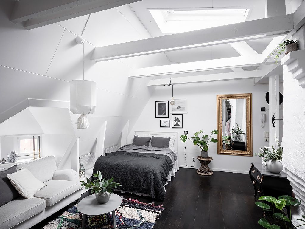 Viihtyisässä nurkassa sijaitseva makuutila luo intiimin ja rauhallisen ilmapiirin, jossa hyvät yöunet on taattu. Pieni työpöytäalue lähellä on täydellinen paikka työntekoon tai luoviin projekteihin, mutta silti kompakti ja tyylikäs. Olohuone, jonka päätehtävänä on luoda kodikas ja lämmittävä ympäristö, on suunniteltu viihtyisäksi ja tyylikkääksi, jolloin voit nauttia tilan rauhasta ja hiljaisuudesta tai viettää aikaa ystävien ja perheen kanssa. Huoneen seinät, näkyvät kattoikkunat ja katot on maalattu klassisen valkoisen sävyin, mikä antaa huoneelle tilavamman ja valoisan ilmeen. Tämä värivalinta auttaa luomaan puhtaan ja avoimen tunnelman, jolloin luonnonvalo pääsee kiertämään vapaasti kaikkialla tilassa. Lattian tummanmusta väri on rohkea ja moderni liike, joka luo kontrastin vaaleampien yksityiskohtien ja tekstiilien välille korostaen niiden visuaalista vaikutusta ja antamalla huoneeseen syvyyttä ja eleganssia. Tumma lattia sävyttää tilaa hienovaraisella draamalla, jolloin vaaleammat elementit, kuten huonekalut ja koriste-asusteet, saavat mahdollisuuden loistaa ja nousta esiin.