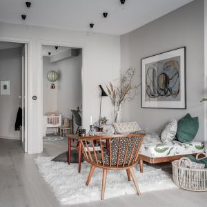 Näkymä, joka avautuu sisään astuessamme asuntoon, johdattaa meidät välittömästi makuutilaan, pieneen työpöytään ja viihtyisään olohuoneeseen. Nämä kolme toiminnallista osaa on järjestetty nerokkaasti yhteen tilavaan tilaan luoden tilan, jossa voit rentoutua, työskennellä ja valmistaa ruokaa tinkimättä arjen mukavuudesta ja tyylistä. Oleskelemaan ja rentoutumiseen kutsuva sohva on sijoitettu strategisesti niin, että se ei ole vain mukava, vaan myös visuaalisesti viehättävä ja samalla osa toimivaa ratkaisua.