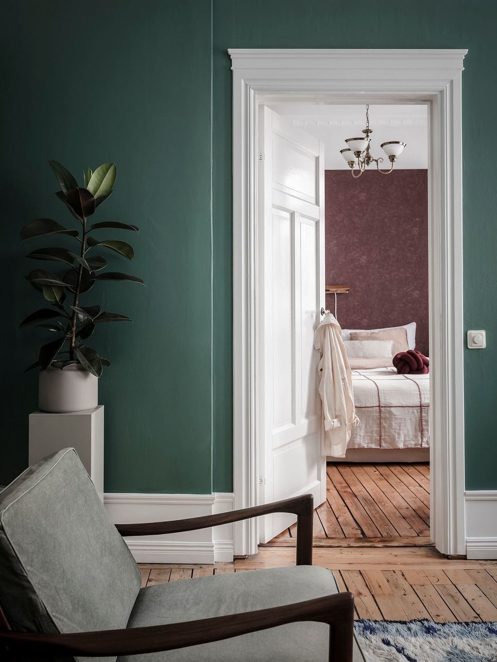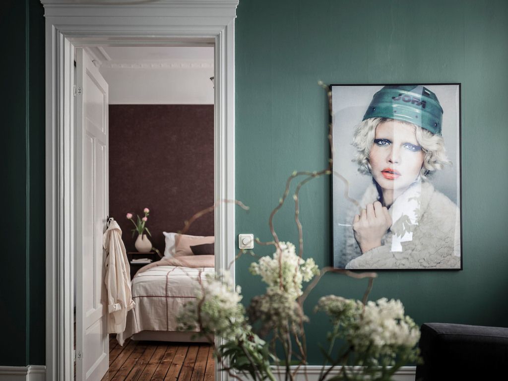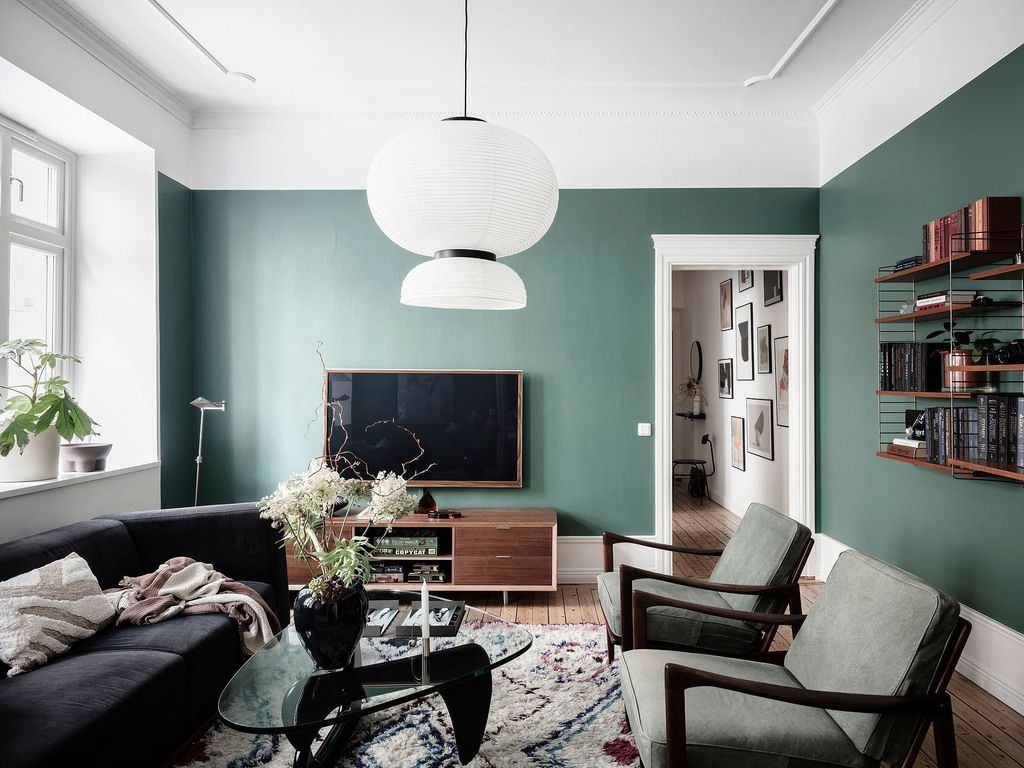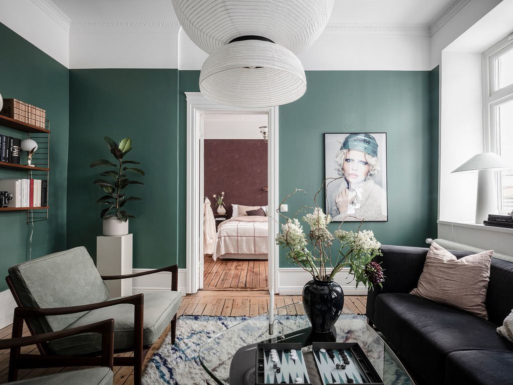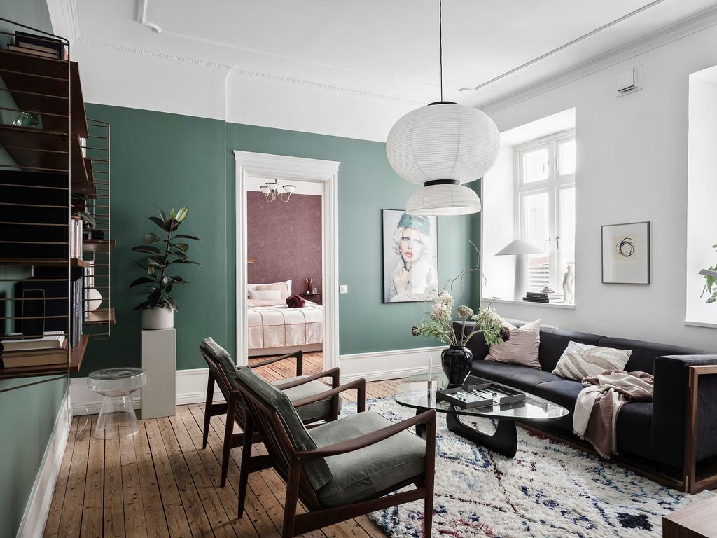 Olohuoneen värimaailma on mielenkiintoinen ratkaisu seinien maalaamiseen, joka antaa huoneelle tyylikkään ilmeen kaksisävyisellä ratkaisulla. Seinä ikkunoineen maalattiin valkoiseksi, kolme muuta seinää maalattiin vihreäksi tiettyyn korkeuteen asti (Alcro sommarlöv), ja sieltä muu seinäpinta kattoon asti valkoiseksi. Tämä maalausmenetelmä lisää visuaalisesti korkeutta jo korkeaan huoneeseen.