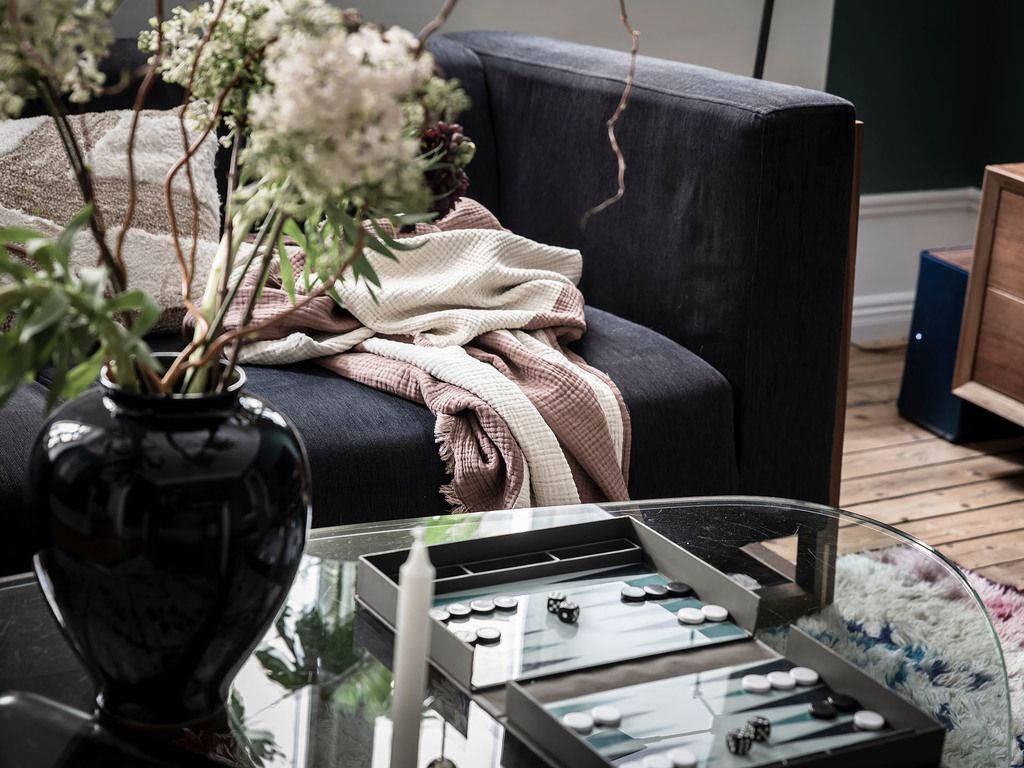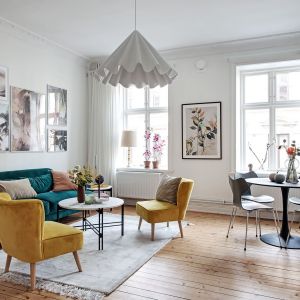 56 neliömetrin remontoidun asunnon olohuone kiinnittää huomiota tyylikkäällä sisustuksellaan.