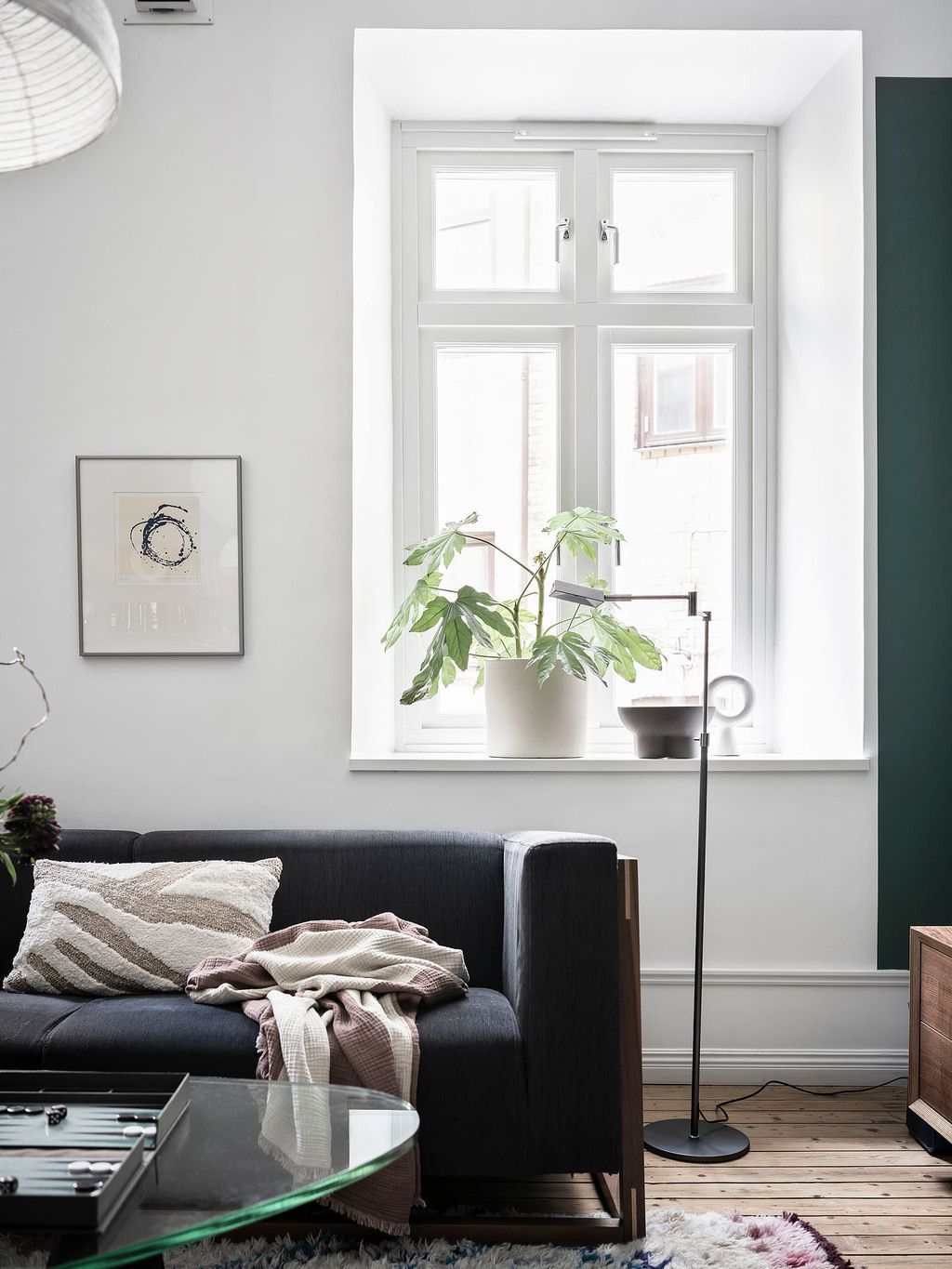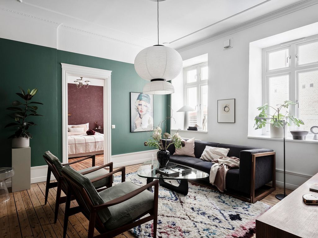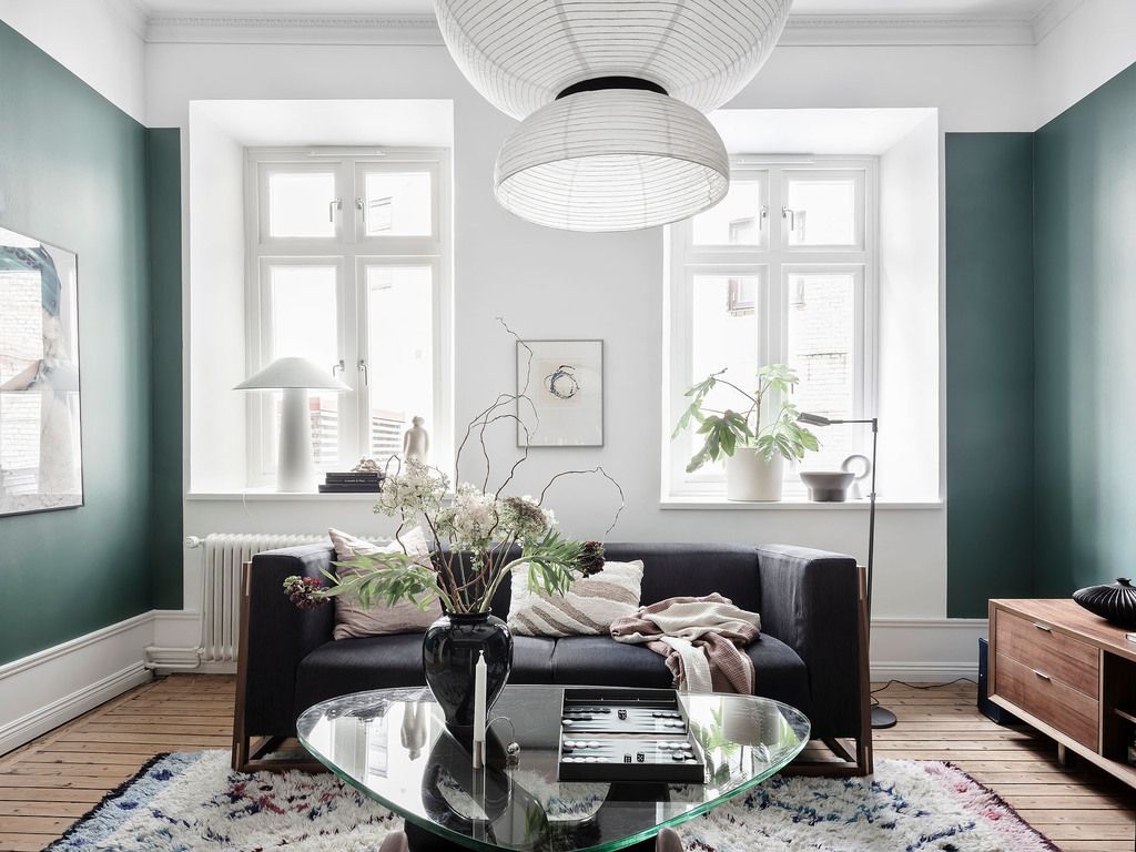 Vihreä on monipuolinen sävy, jolla voi olla ihanan rauhoittava vaikutus, kun se tasapainotetaan valkoisen kanssa ja jota korostetaan sävyillä, kuten musta, harmaa, ruskea ja vihreä, jotka auttavat luomaan yhtenäisen tyylin. Tämän olohuoneen huonekalujen valinnassa on huomioitu huoneen koko ja värien yhteensopivuus. Huoneen keskipisteenä on huonekaluryhmä - tummanharmaa kangas sohva, lasinen sohvapöytä ja kaksi toisiaan täydentävää nojatuolia, jotka muodostavat kokonaisuuden pitkäpintaisella matolla.