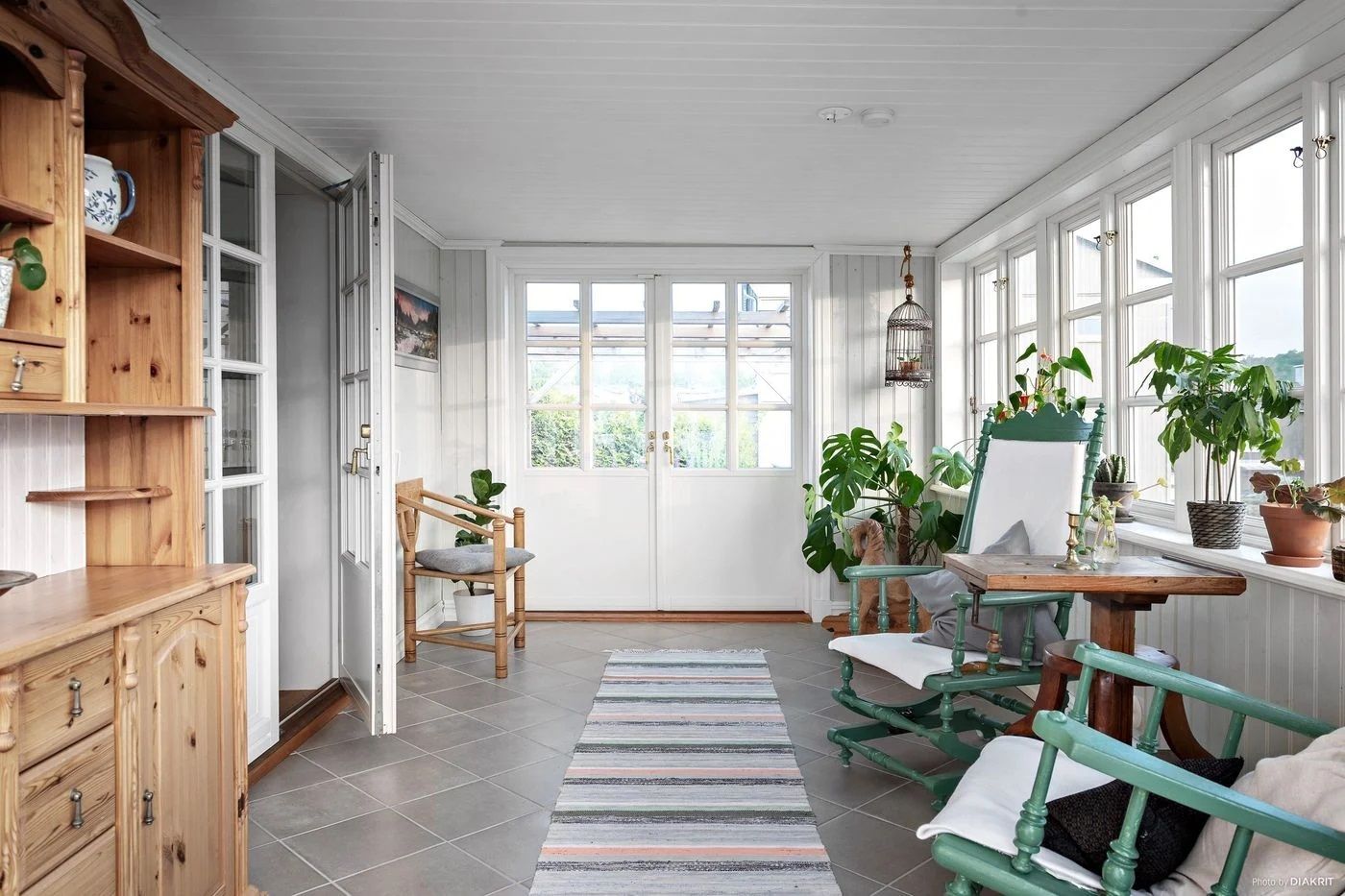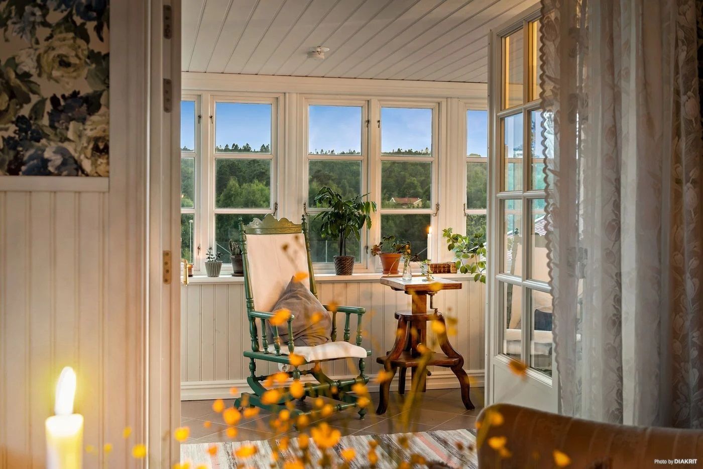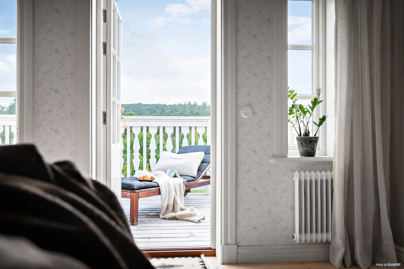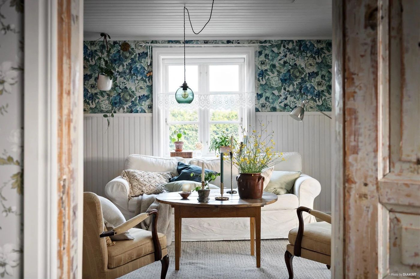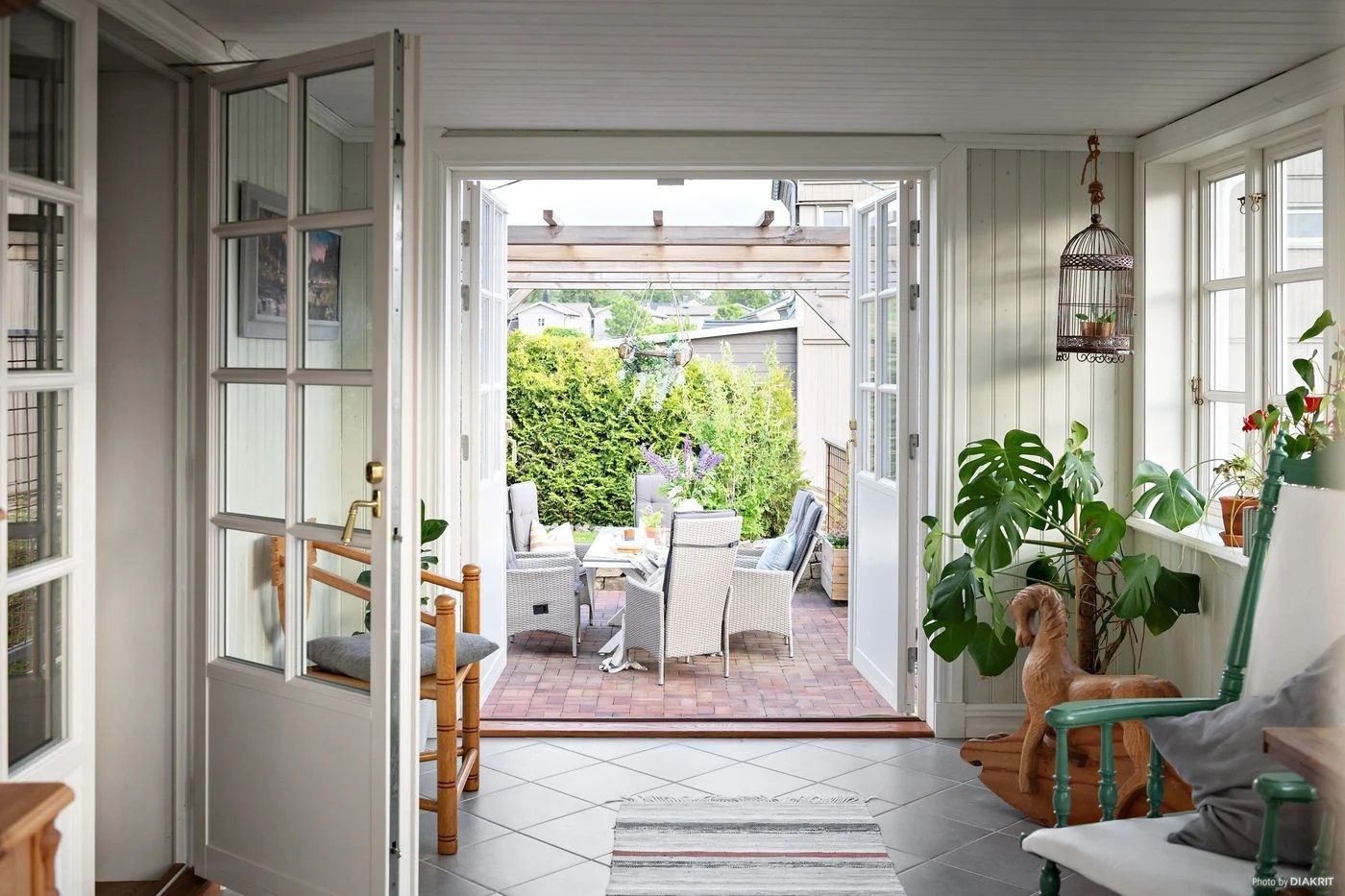 Ruokasalista johtaa iso aukko olohuoneeseen, jossa molemmille puolille avautuvat ovet johtavat pienelle, viihtyisälle verannalle. Verannalla kiinnittävät huomiota kauniit vihreäksi maalatut antiikkiset lepotuolit, jotka erottuvat kauniisti valkoista taustaa vasten. Veranta johtaa myös pienelle parvekealueelle, jossa voit nauttia aamukahvisi tai viettää aikaa ystävien kanssa. Olohuoneessa on sama kaunis kukkainen tapetti ja valkoiset seinäpaneelit kuin ruokasalissa, mikä auttaa yhdistämään kauniisti kaksi erilaista tilaa. Tästä olohuoneesta tulee myös kodin ensimmäinen makuuhuone, jossa kaunis tapettivalikoima seinillä lisää katseenvangitsijaa.