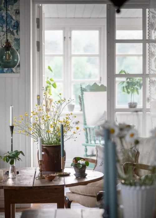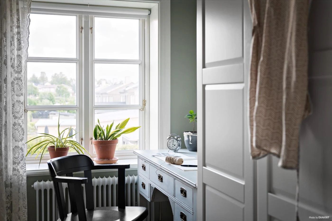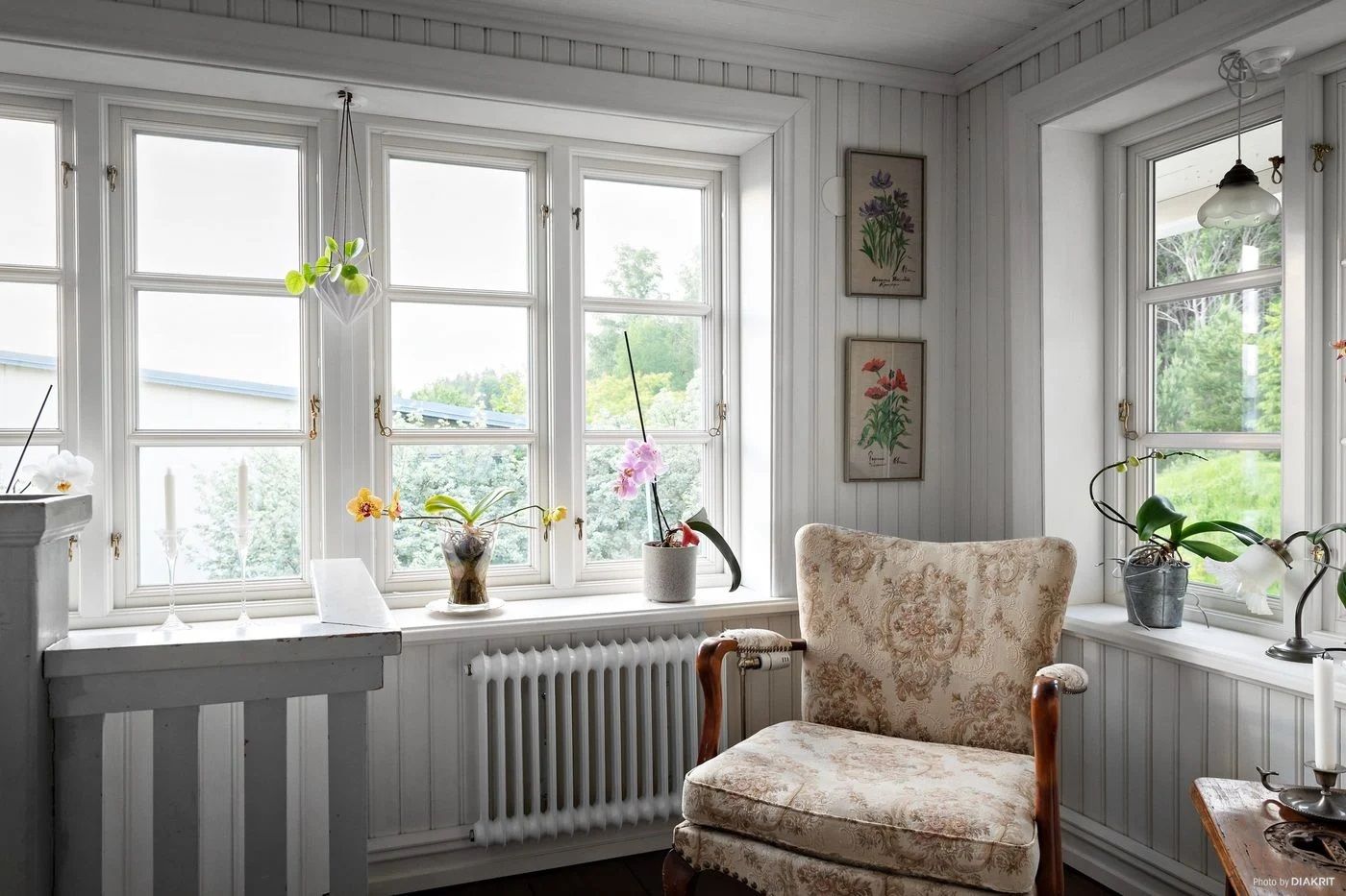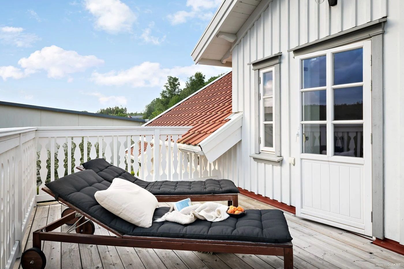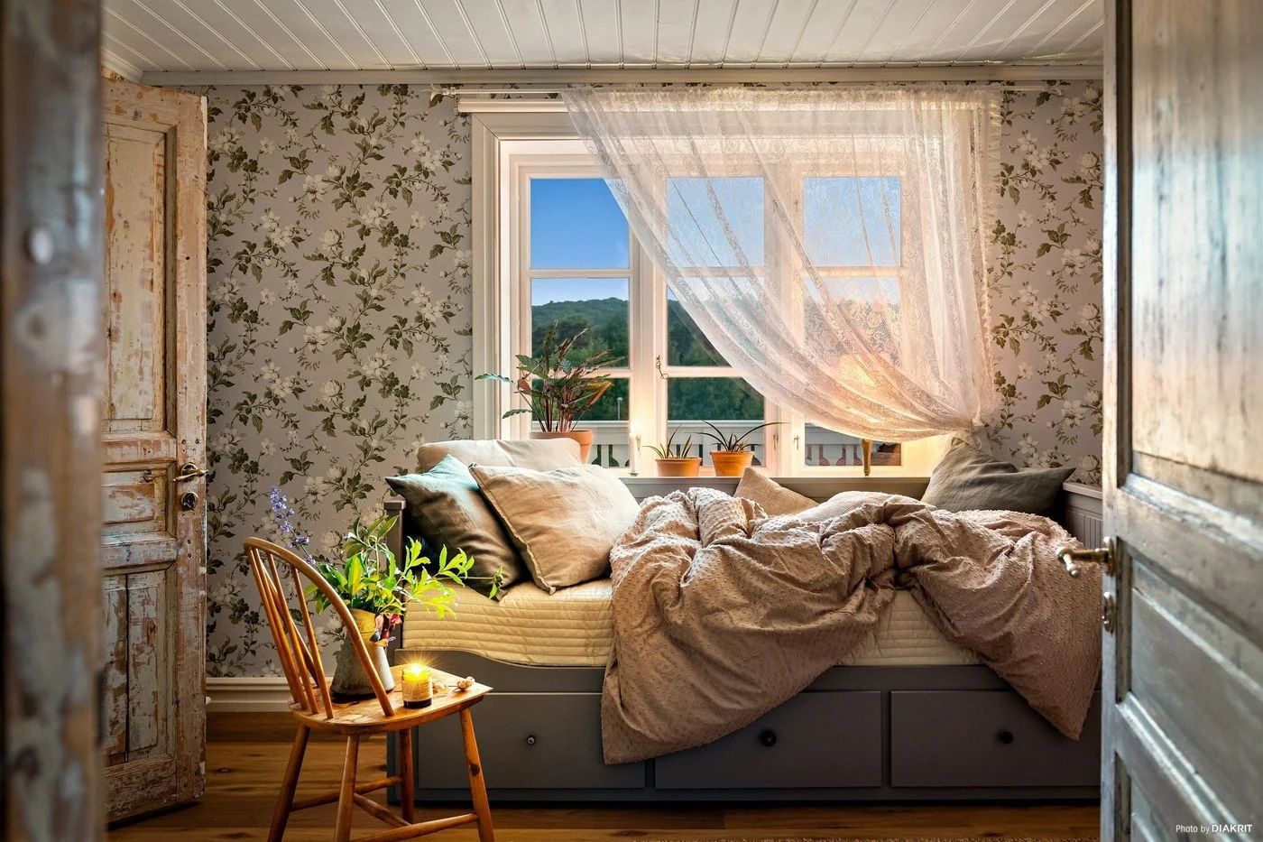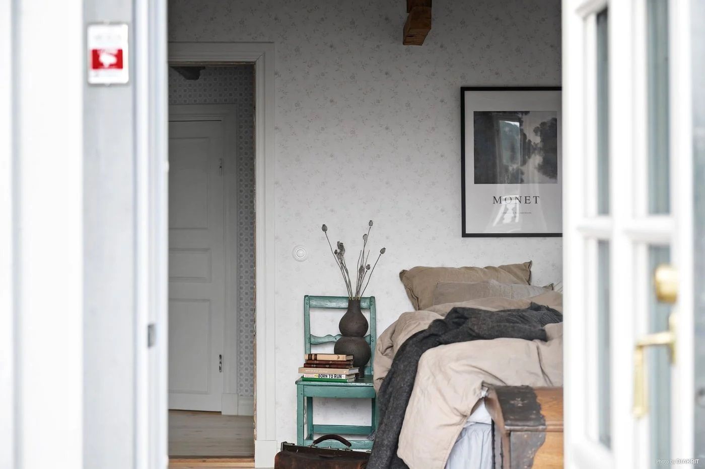 Ruokasalista johtaa iso aukko olohuoneeseen, jossa molemmille puolille avautuvat ovet johtavat pienelle, viihtyisälle verannalle. Verannalla kiinnittävät huomiota kauniit vihreäksi maalatut antiikkiset lepotuolit, jotka erottuvat kauniisti valkoista taustaa vasten. Veranta johtaa myös pienelle parvekealueelle, jossa voit nauttia aamukahvisi tai viettää aikaa ystävien kanssa. Olohuoneessa on sama kaunis kukkainen tapetti ja valkoiset seinäpaneelit kuin ruokasalissa, mikä auttaa yhdistämään kauniisti kaksi erilaista tilaa. Tästä olohuoneesta tulee myös kodin ensimmäinen makuuhuone, jossa kaunis tapettivalikoima seinillä lisää katseenvangitsijaa.