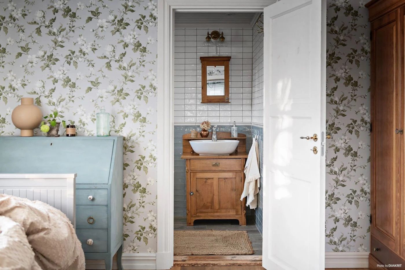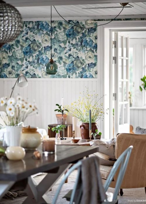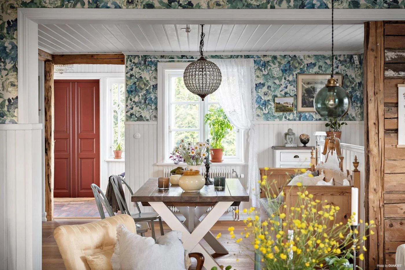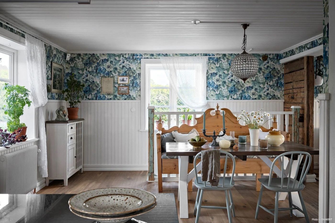 Ruokailutilan ja keittiön lattiaa peittää lämmin ja luonnollinen puuparquet, jonka sileä pinta tasapainottaa klassisia seinäpintoja – valkoisia, osin paneloituja ja osin kukkakuosisella tapetilla koristeltuja. Juuri tuo tapetti antaa huoneelle sen luonteen – hieman nostalginen, mutta täysin ajan hermolla.