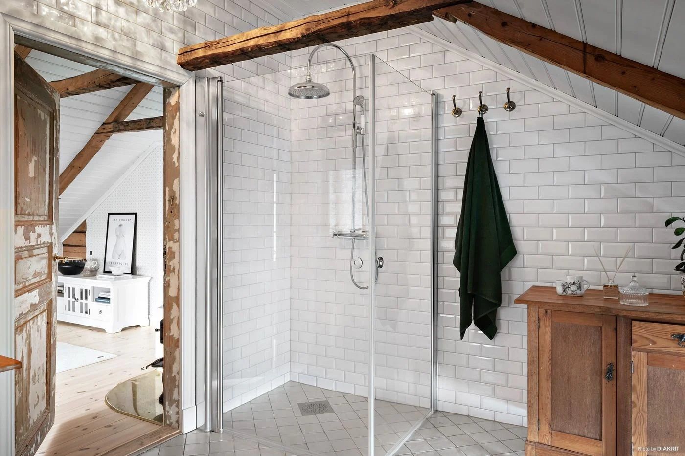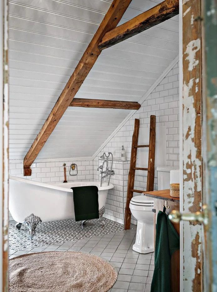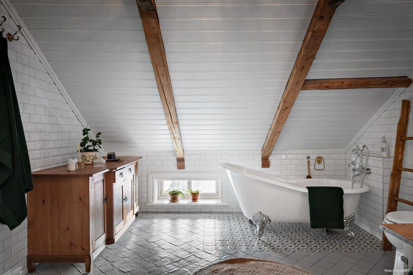 Kaunis kylpyhuone, jossa tila on erittäin tyylikkäästi suunniteltu. Upea kynsijalkakylpyamme, vanhat kattopalkit ja antiikki lipasto sekä hyvin valitut keraamiset laatat luovat upean lopputuloksen.