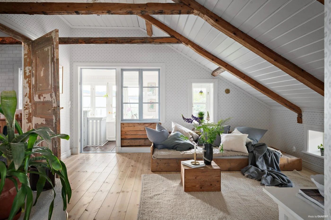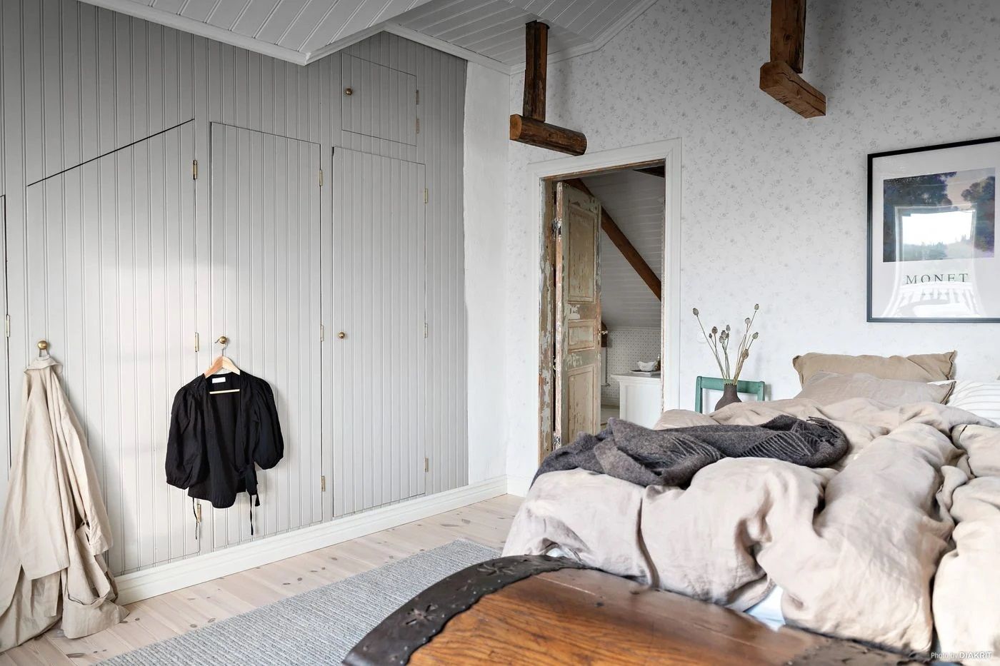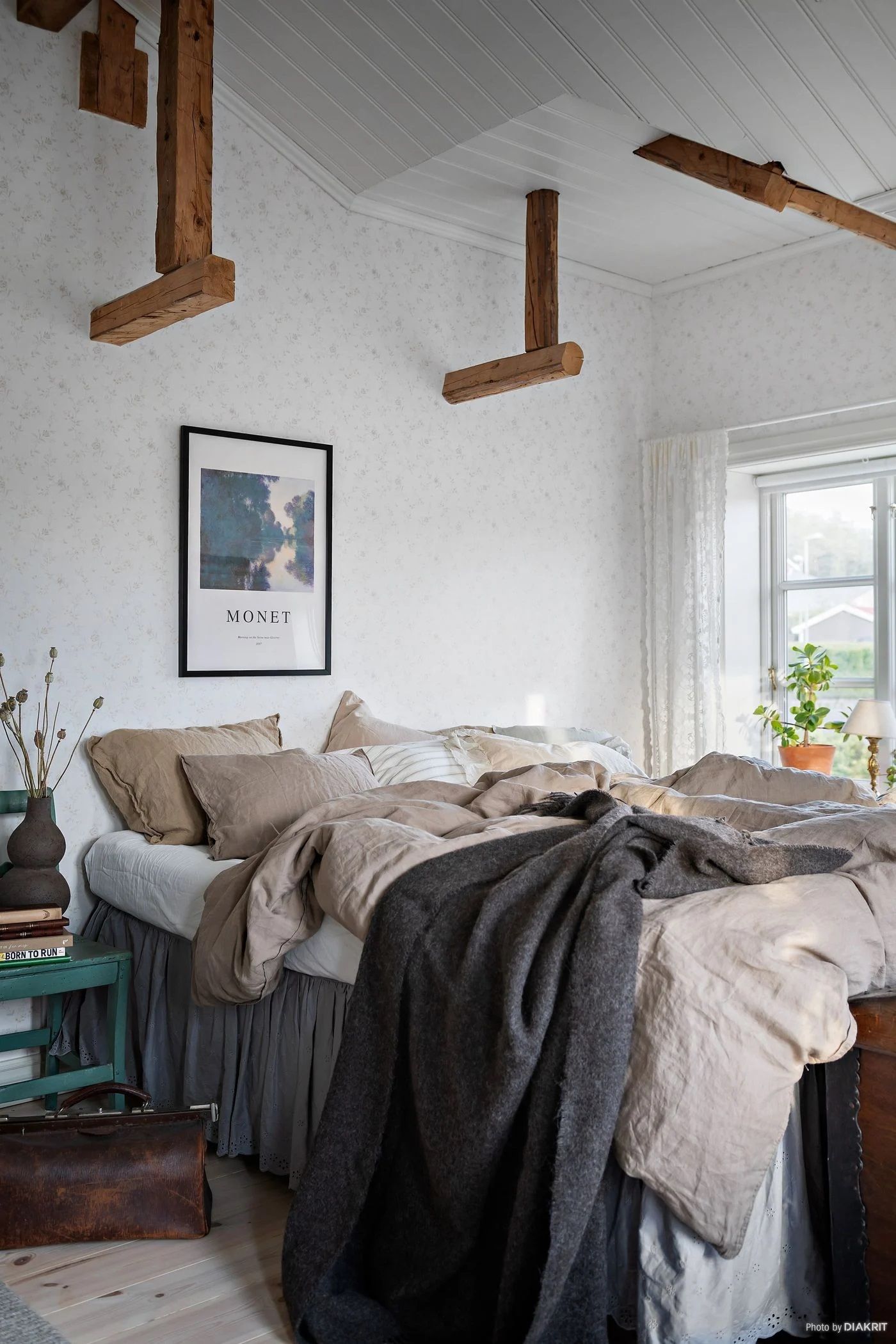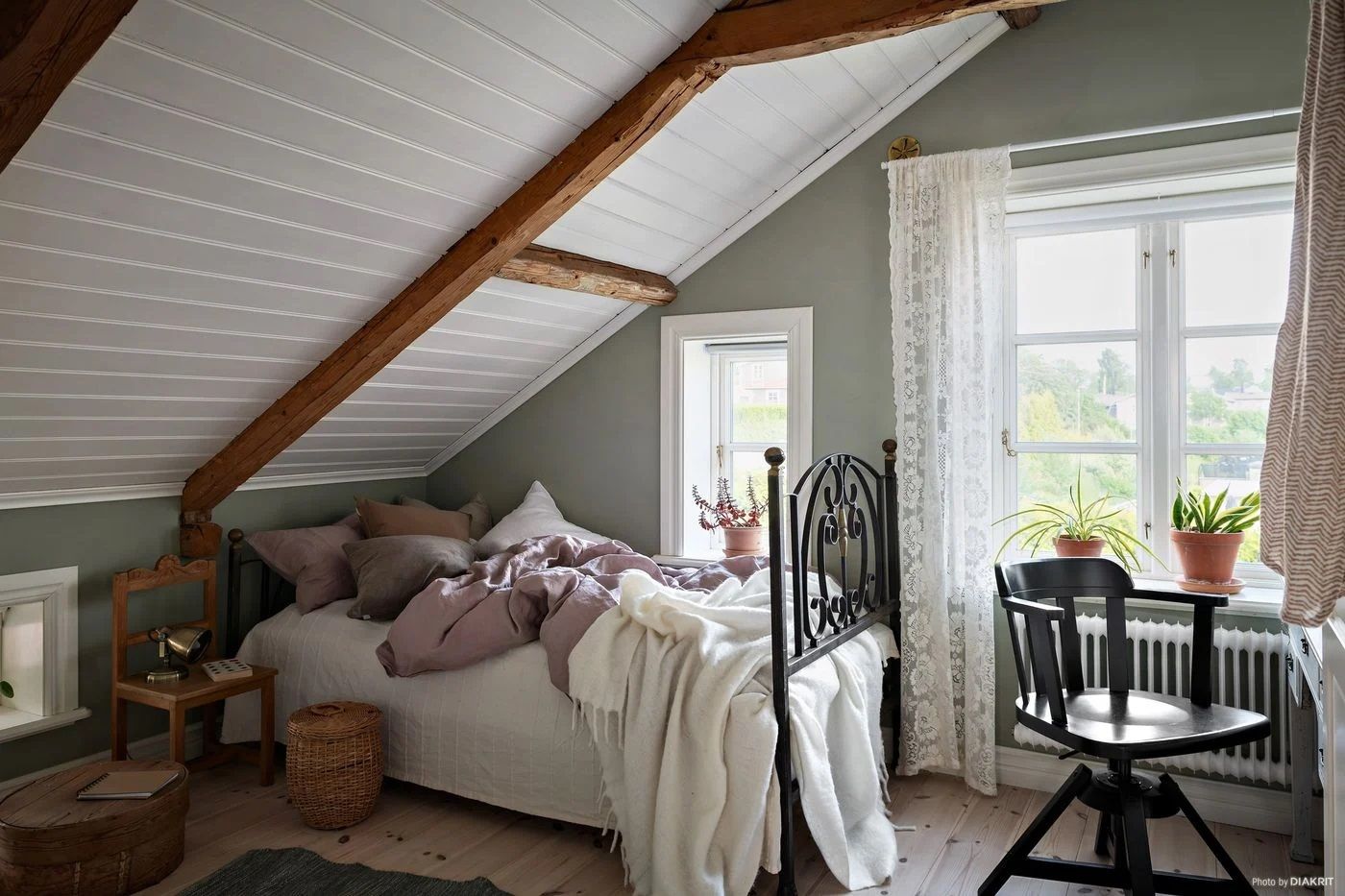 Viihtyisä makuuhuone, jossa vaaleanvihreä-harmaat seinät, vanhat puupalkit katossa lisäävät tehoa.