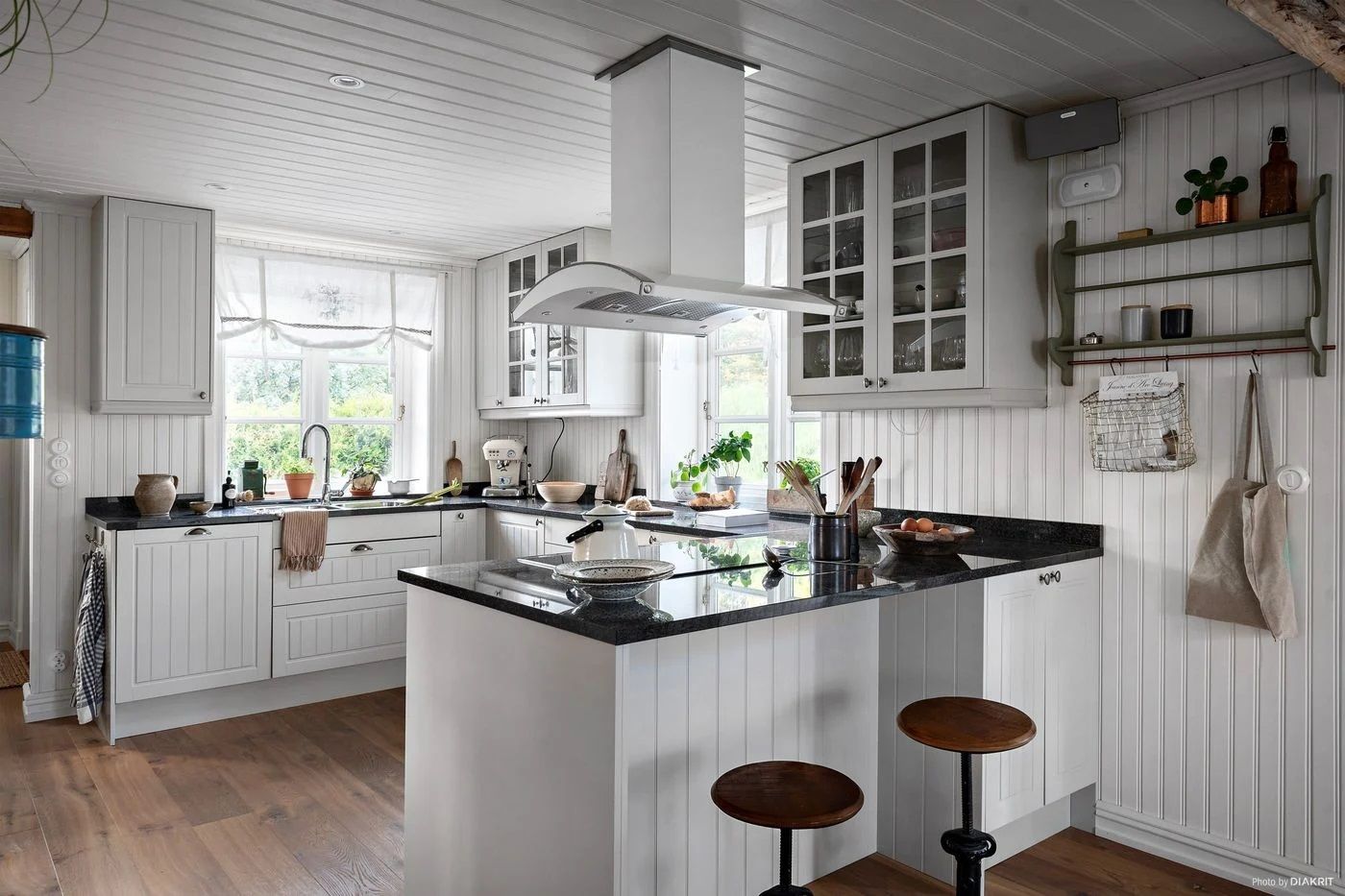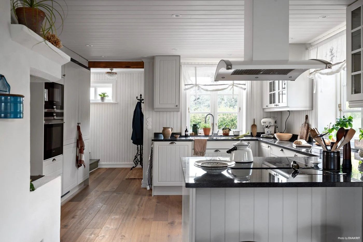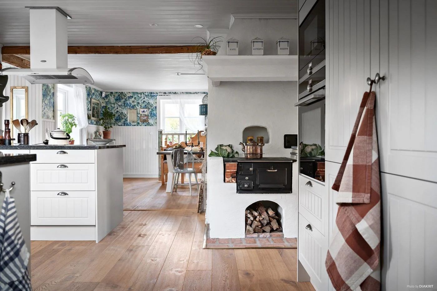 Eteisestä tie johtaa suoraan avokeittiöön ja ruokailutilaan – tilaan, jossa jokainen aamu alkaa ja jokainen ilta kokoaa perheen yhteen. Vaaleanharmaat, skandinaaviseen tyyliin suunnitellut keittiökalusteet luovat rauhallisen taustan, jota korostaa musta kivitaso – yksityiskohta, joka tuo tilaan eleganssia ja ajatonta ylellisyyttä. Todellinen helmi seisoo kuitenkin hiljaa ja arvokkaasti omalla paikallaan: toimiva puuhella, joka tarjoaa paitsi lämpöä ja kauneutta myös muistoja ajoista, jolloin elämä soljui hitaammin ja rauhallisemmin.