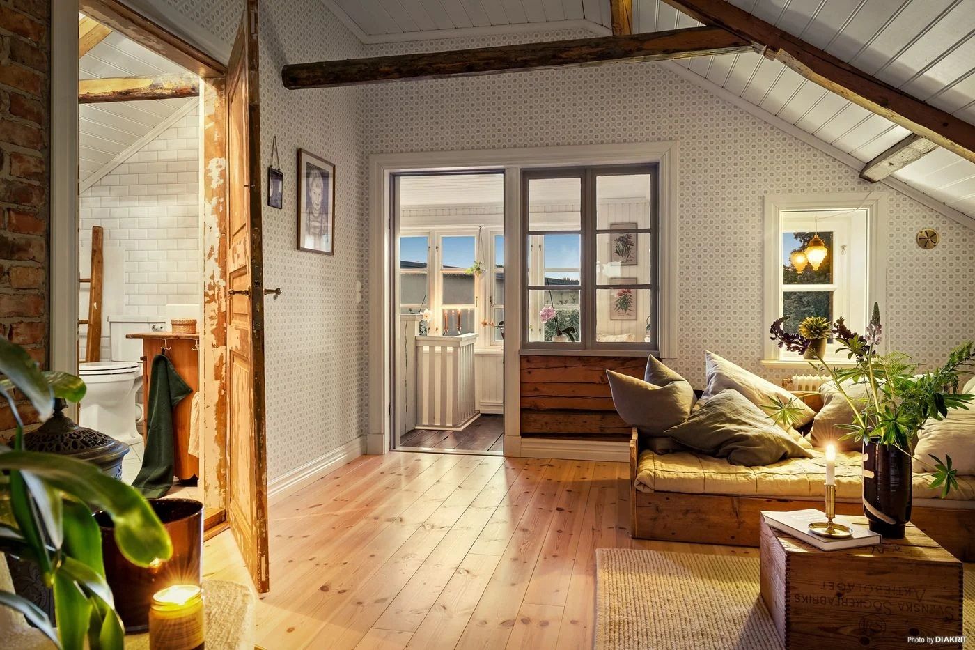 Päämakuuhuoneessa on samat kauniit puiset kattopalkit ja parvekkeelle johtavat pariovet.