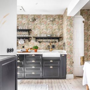 Jotta mustat keittiökalusteet eivät näyttäisi liian painavilta, se yhdistetään valkoisiin seiniin, jotka tuovat enemmän valoa ja tilaa huoneeseen. Alkuperäiset puiset seinäpaneelit on viimeistelty valkoiseksi ja työtason takana oleva seinä on päällystetty keraamisilla laatoilla, joissa mustat laastiviivat luovat hienovaraisen mutta tehokkaan kontrastin. Kokonaisvaikutelmaa tasapainottaa luonnonpuulattia, jonka lämmin sävy pehmentää mustien keittiökalusteiden vahvuutta ja lisää huoneeseen viihtyisyyttä.