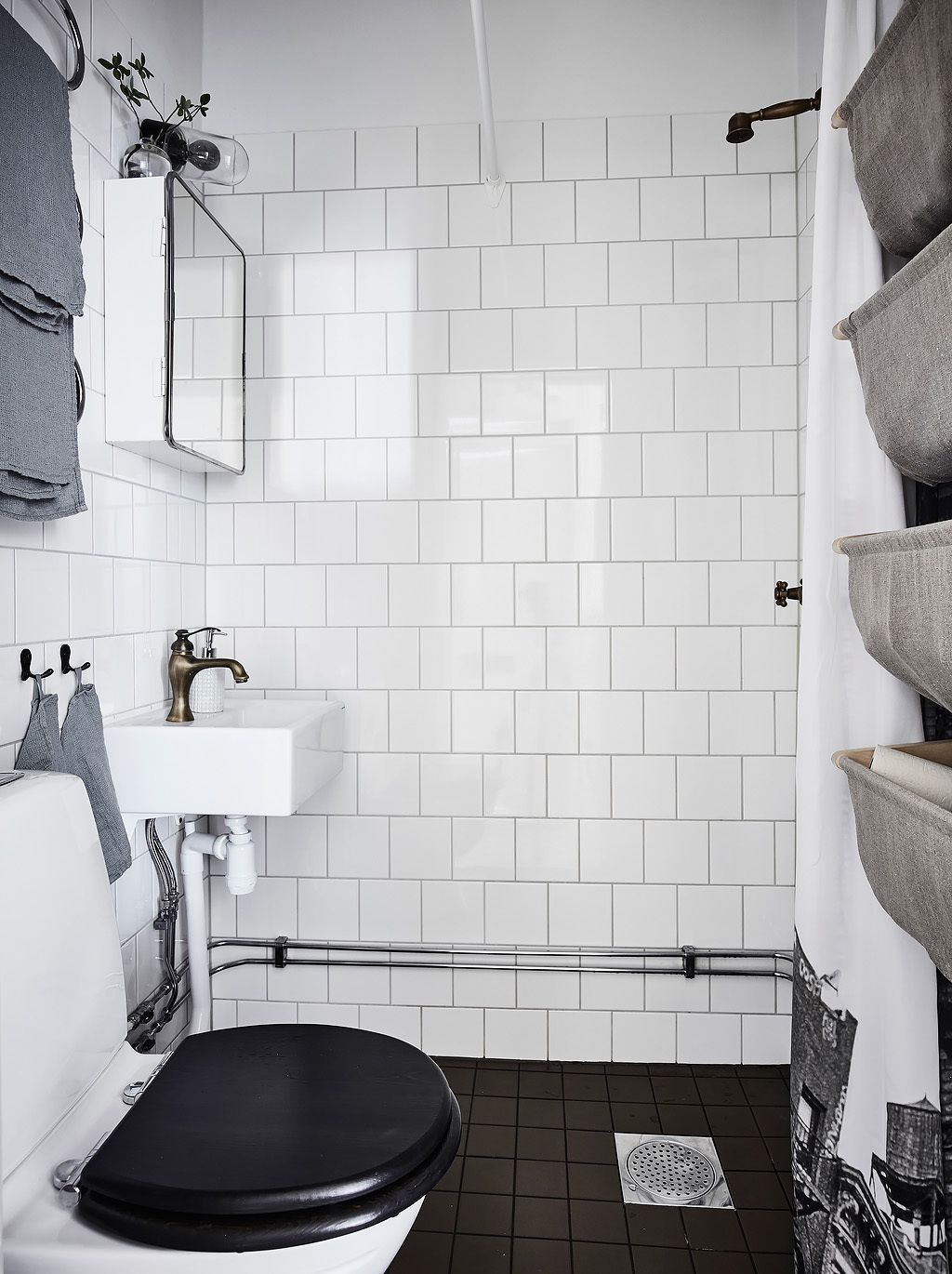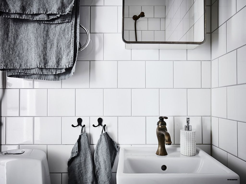 Tyylilisäelementtinä kylpyhuoneessa käytetään myös harmaita pyyhkeitä, jotka ovat pehmeitä ja vohvelikuvioisia. Nämä pyyhkeet eivät vain lisää tekstuuria huoneeseen, vaan täydentävät myös yleistä väripalettia sitoen harmaan sävyn seinälaattojen saumoihin ja luoden siten yhtenäisen vaikutelman. Viimeisen silauksen kylpyhuoneen ja wc:n suunnitteluun ovat huolella valitut messinkihanat sekä suihku- että pesuallasalueella. Nämä yksityiskohdat lisäävät tilaan modernia tunnelmaa, kun taas niiden klassinen messingin sävy sulautuu täydellisesti mustavalkoiseen yhdistelmään korostaen kylpyhuoneen yleistä tyyliä ja persoonallisuutta. Kaikki nämä elementit yhdessä muodostavat toimivan ja tyylikkään pienen kylpyhuoneen, jossa jokainen yksityiskohta on huolellisesti harkittu, mikä johtaa loistavaan tasapainoon käytännöllisyyden ja estetiikan välillä.