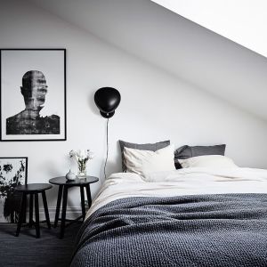 Minimalistiset mustat seinävalaisimet ovat hienovarainen mutta tehokas lisä, joka täydentää koko makuuhuoneen suunnittelua. Nämä valaisimet luovat hienotunteisen mutta silmiinpistävän kontrastin valkoisen ja beigen väripaletin välille tarjoten juuri tarpeeksi visuaalista mielenkiintoa olematta kuitenkaan liian hallitsevia. Myös jotkut harmaat koriste-elementit, jotka on sijoitettu ikkunalaudoille, lisäävät tilaan uuden hienovaraisen kerroksen, mikä antaa herkän tasapainon ja viimeistellyn ilmeen. Kaikki nämä huolellisesti valitut elementit ja yksityiskohdat yhdessä luovat tilan, joka ei ole vain visuaalisesti harmoninen, vaan myös käytännöllisesti mukava ja toimiva. Jokainen yksityiskohta on asetettu paikoilleen suurella huolella ja huomiolla, mikä luo kokonaisuuden, joka heijastaa rauhaa, tasapainoa ja eleganssia.