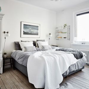 Valkoiseksi maalattu puulattia, joka peittää koko huoneen, luo upean kontrastin ja korostaa tapetin vivahteita. Lattiassa olevat puuraot lisäävät huoneeseen luonnetta ja antavat sille hieman maalaismaisen ja luonnollisen tunnelman. Valkoinen lattia korostaa myös korkeat, tyylikkäät valkoiset jalkalistat, jotka kehystävät huonetta ja luovat visuaalisesti puhtaan ja järjestetyn ilmeen. Koko makuuhuone heijastelee minimalismin ja yksinkertaisuuden kauneutta, jota tukevat valkoiset huonekalut, kuten minimalistinen vaatekaappi ja tyylikäs lipasto. Nämä huonekalut eivät palvele vain käytännöllistä tarkoitusta, vaan myös harmonisoituvat täydellisesti muun sisustuksen kanssa tuoden huoneeseen valoa ja avaruutta.