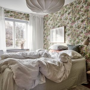Tässä tilavassa ja tyylikkäässä makuuhuoneessa on todella harmoninen tunnelma, joka on luotu huolellisesti valituilla materiaaleilla ja väreillä. Ensi silmäyksellä erottuvat tyylikkäät, pehmeät sävyt, jotka luovat rauhallisen ja rentouttavan tunnelman. Seinät on peitetty silmiinpistävällä tapetilla, jota hallitsee luonnollinen ja herkkä beige värimaailma. Tässä tapetissa kuvatut kani-aiheet lisäävät pehmeitä ja leikkisä yksityiskohtia säilyttäen samalla tyylikkään kokonaisvaikutelman. Tapetin on luonut Emma von Brömssen ja sen muotoilu heijastelee taitavasti luonnon kauneutta luoden rauhoittavan ja ainutlaatuisen tunnelman, joka sopii täydellisesti makuuhuoneeseen.